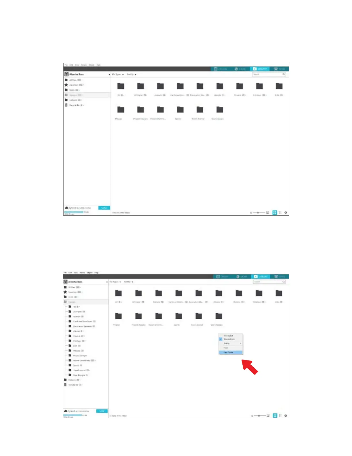 To add folders to your library, click on the Designs folder. Right-click on any empty space in the folder and select “New