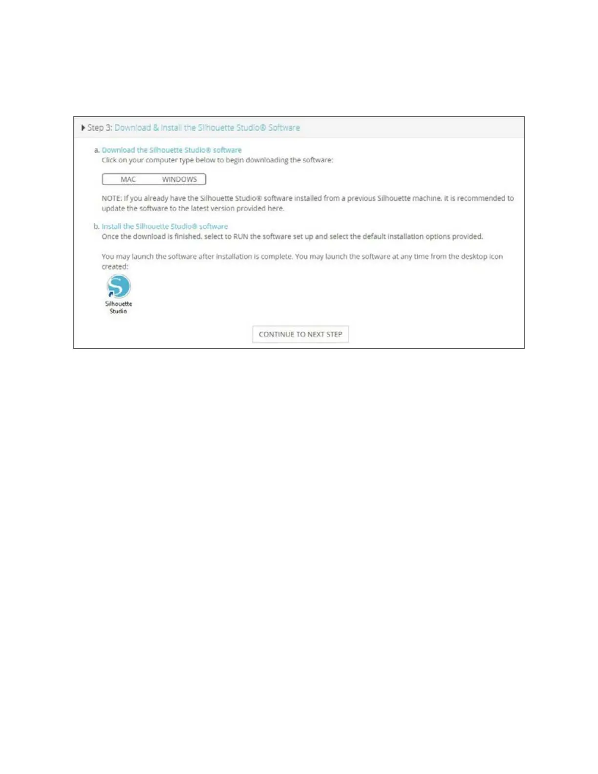 Go to step 3 on SilhouetteAmerica.com/setup to download the latest version of Silhouette Studio®. Click on your