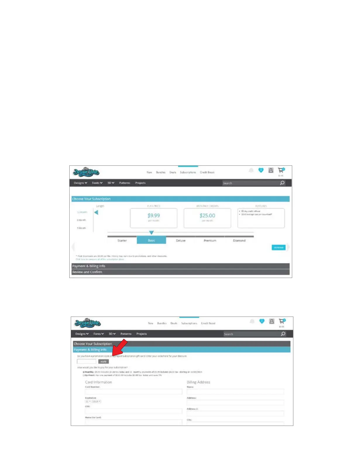 With a subscription, you’ll get a certain number of credits every month to purchase designs. The number of credits you