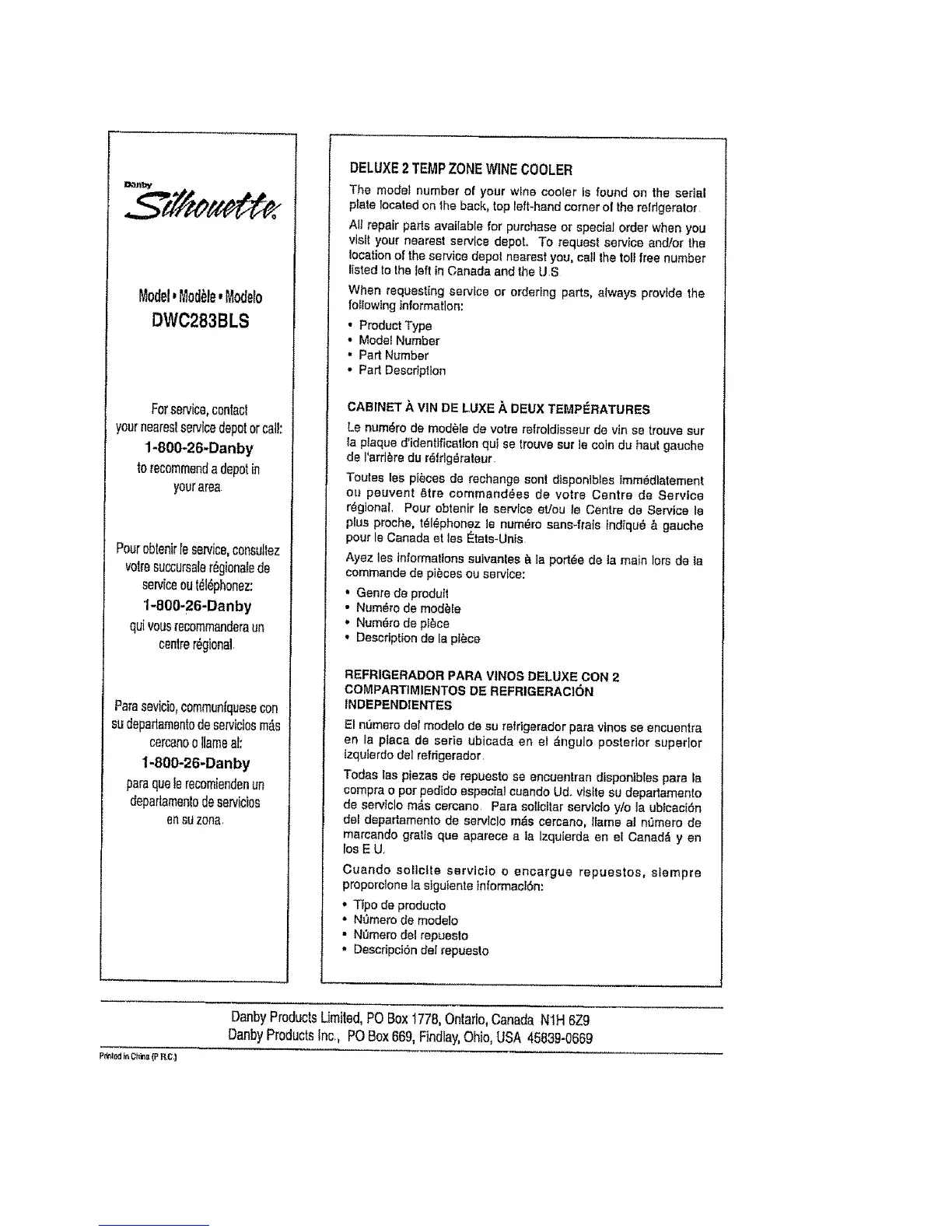 DanbyProductsUmited,PCBox1778,Ontario,CanadaNtH 6Z9