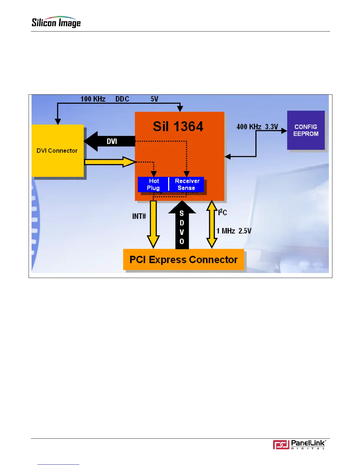 operates at 400kHz at 3.3V. The SiI 1364 Tx has internal 3.3V pull-up resistors for this bus; therefore, no external