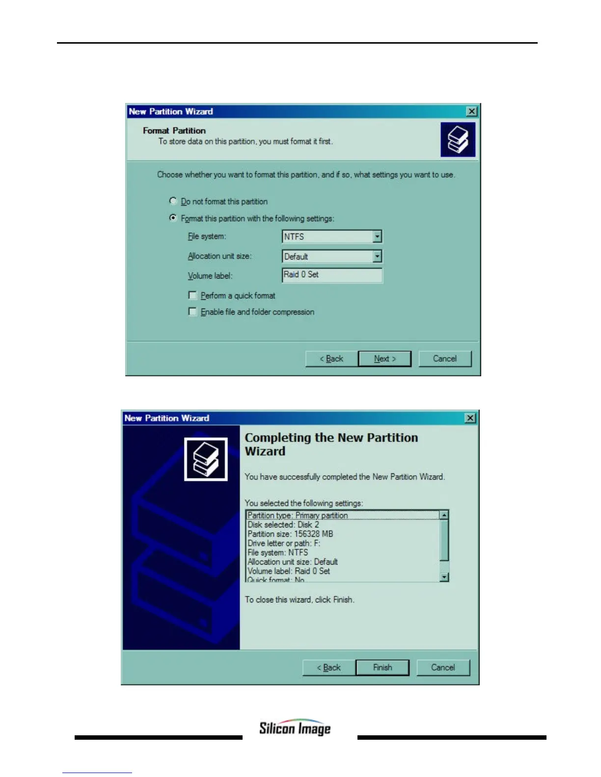 creation of the partition. Make sure the Format this partition. . .” radio button is selected. Name the volume as desired