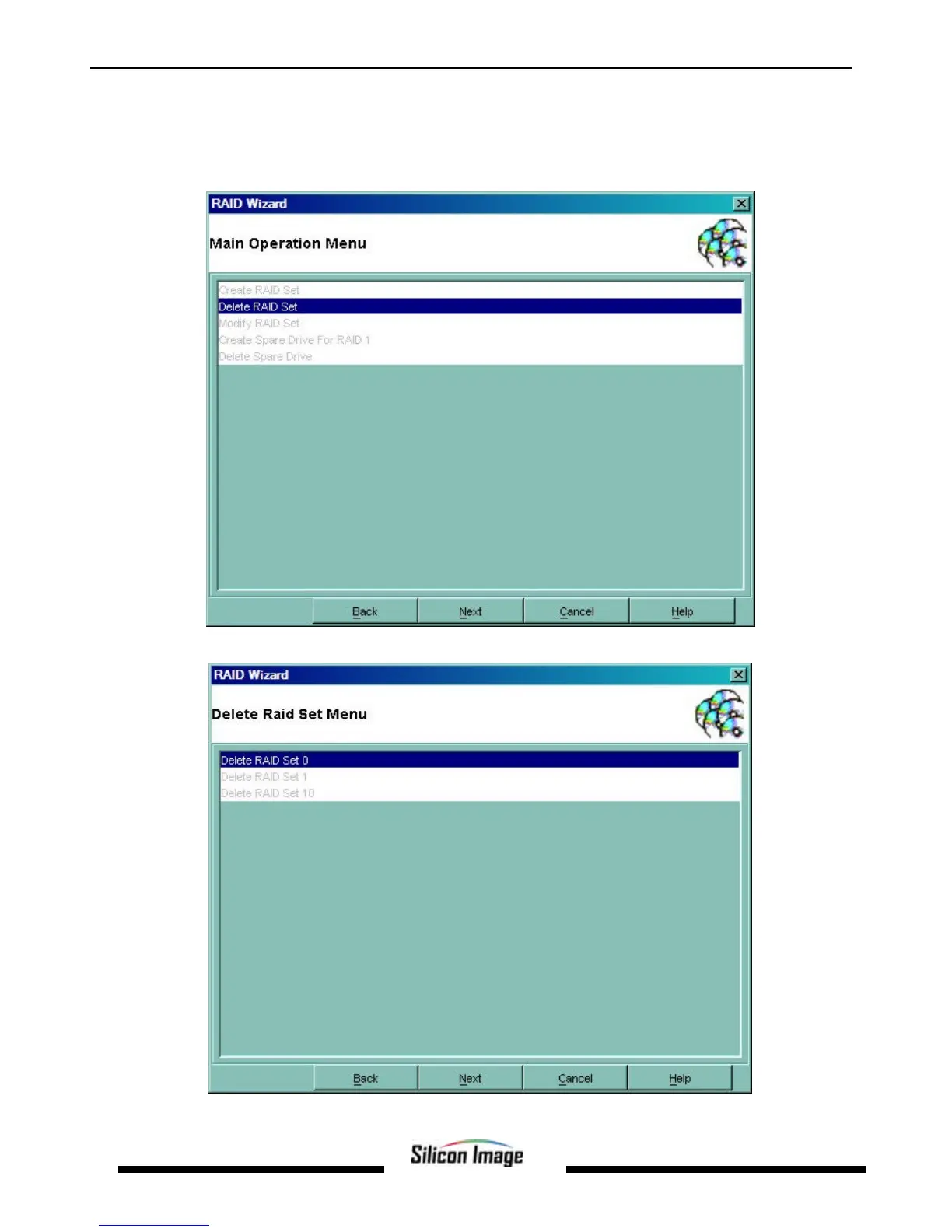 1. Start the RAID Wizard. Select “Delete RAID Set” and click Next.