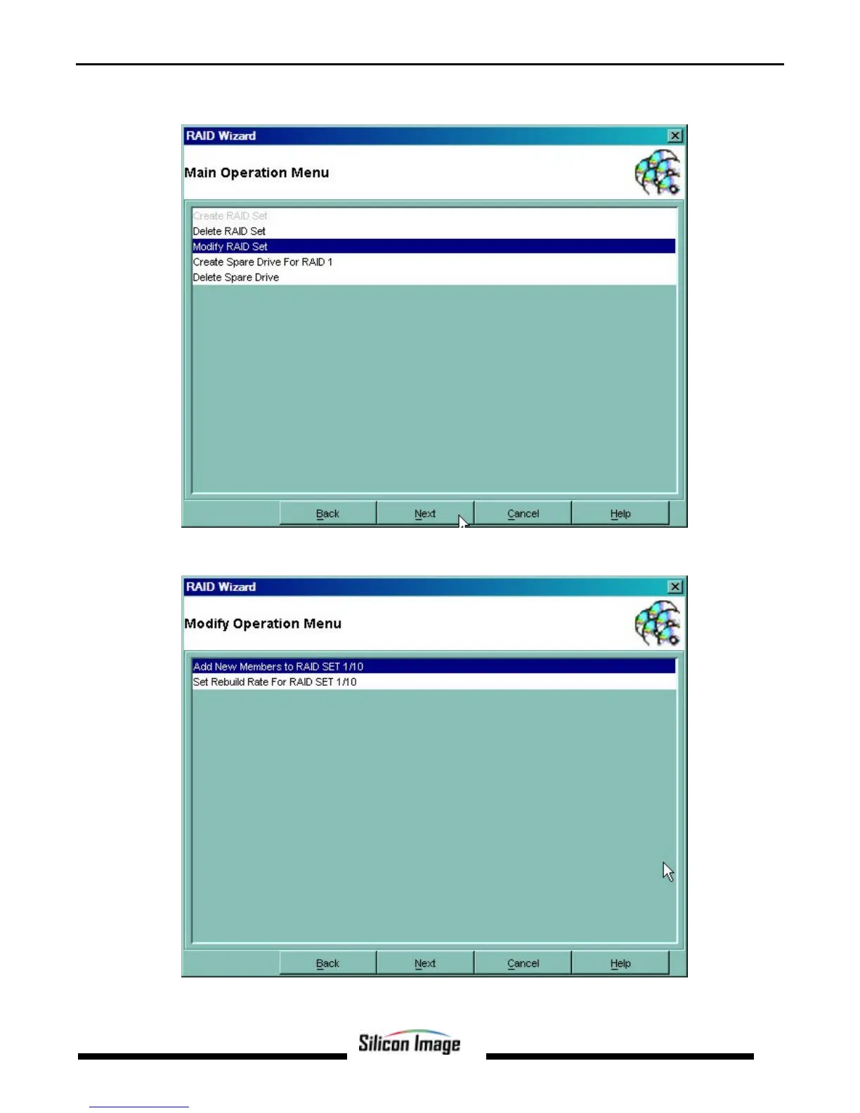 1. Start the RAID Wizard. Select “Modify RAID Set” and click Next.