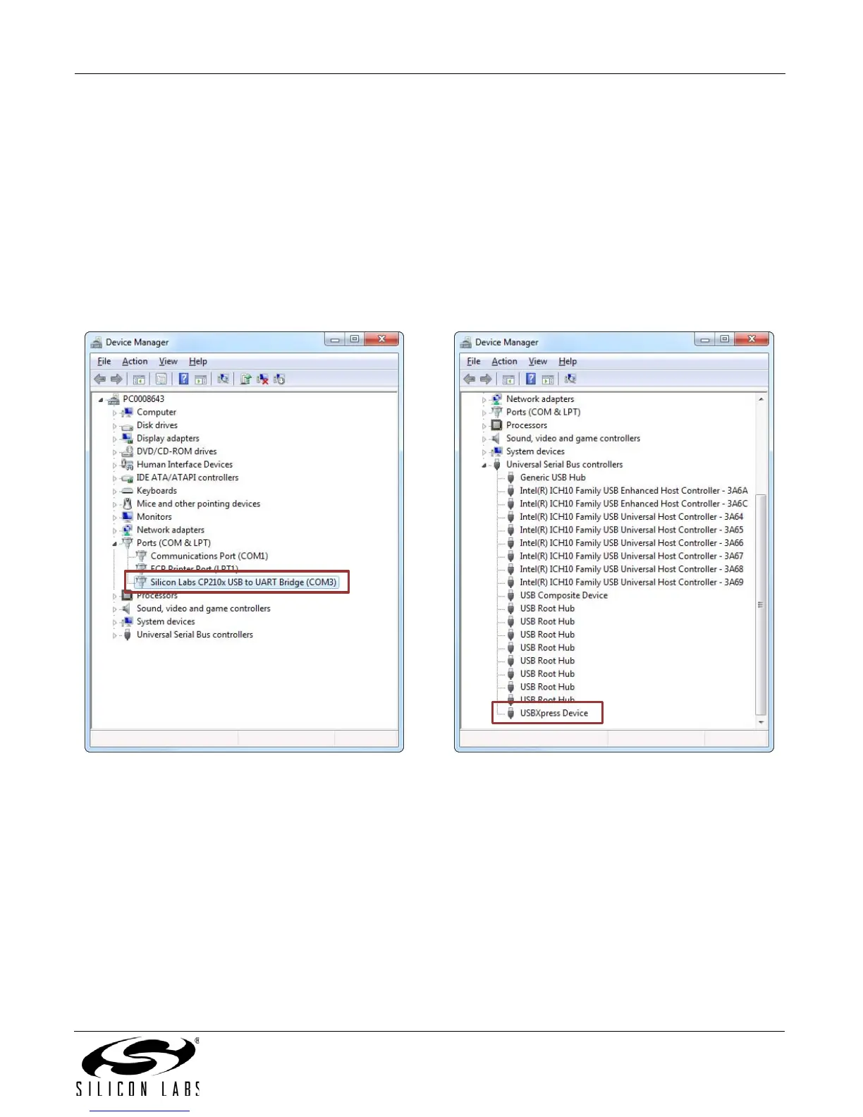 If the USBXpress drivers are used, the CP2102 will appear as a USB USBXpress device as shown in Figure 2.
