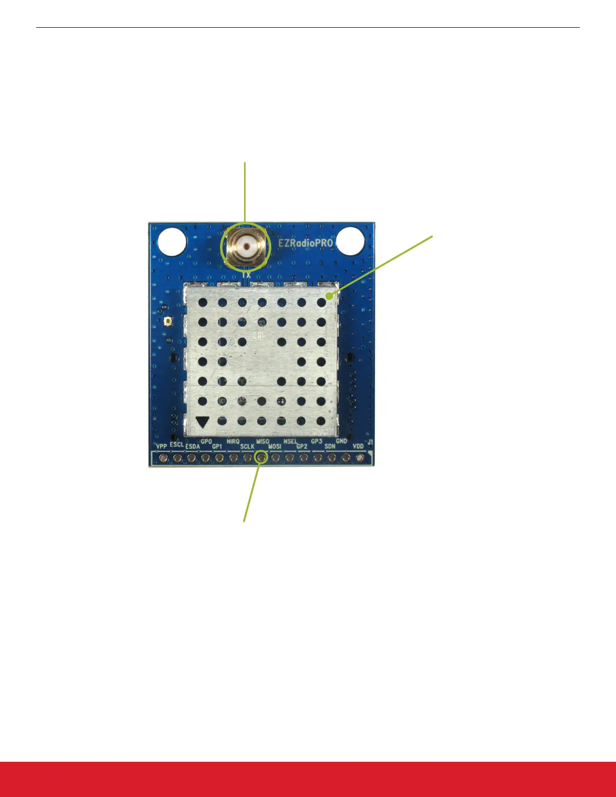 The RF pico board is a radio module that contains an EZRadio IC, a matching network, and an SMA connector on the top side. Other