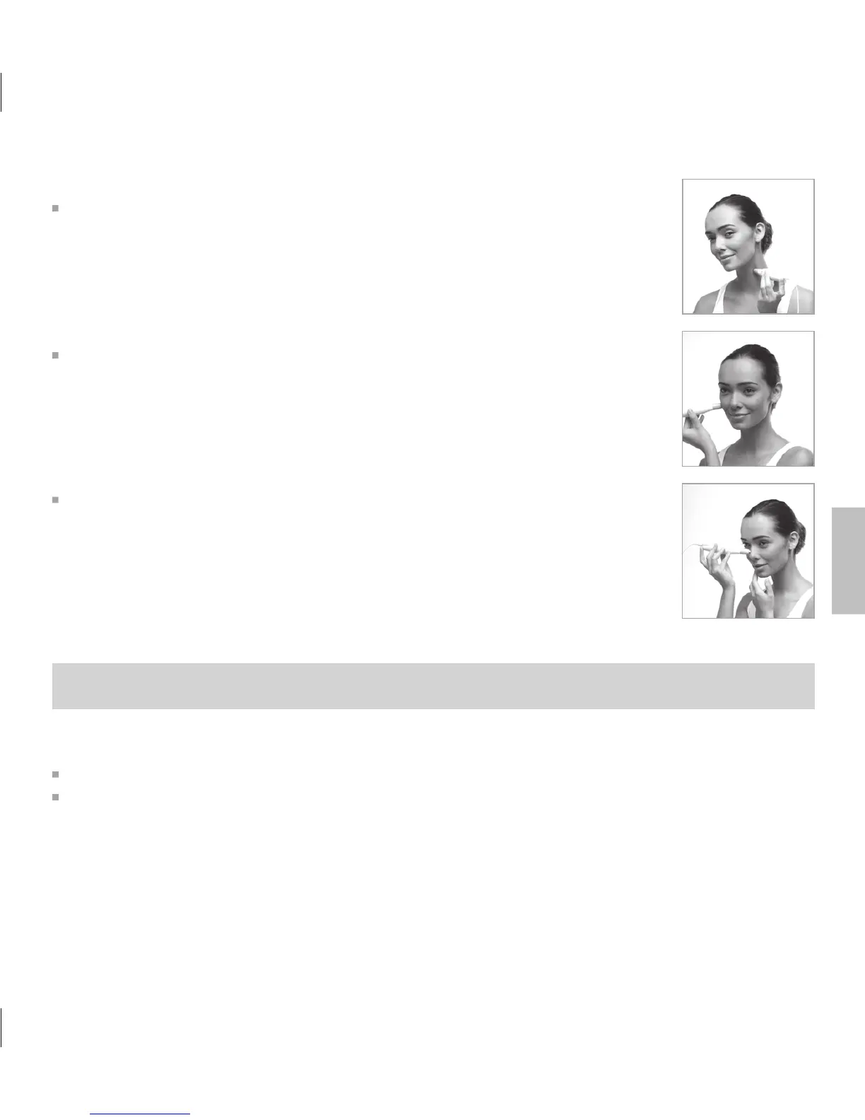 Undvik noga de känsliga ögonlocken. Fortsätt till näsområdet. Dra rakt nedåt och följ