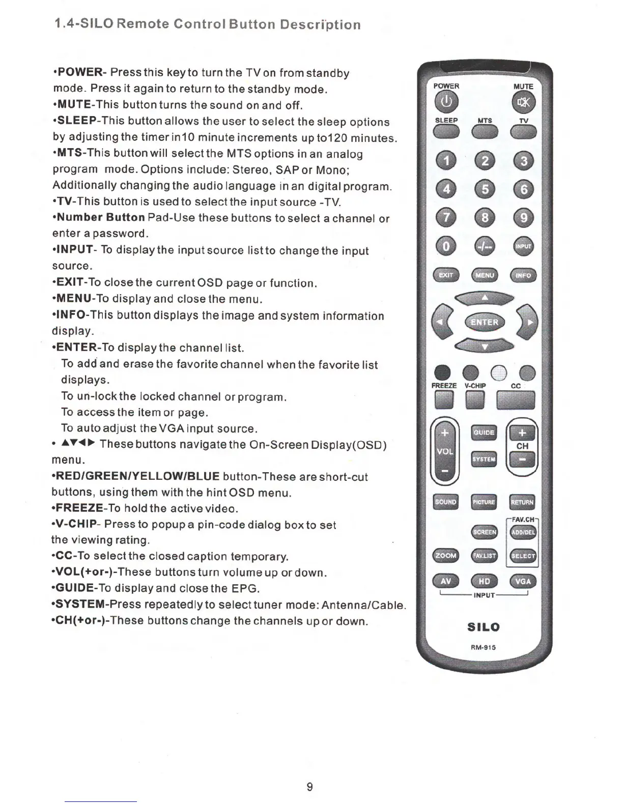 Silo LTV-32PRM - Remote Control Operation; Remote Control Button Functions