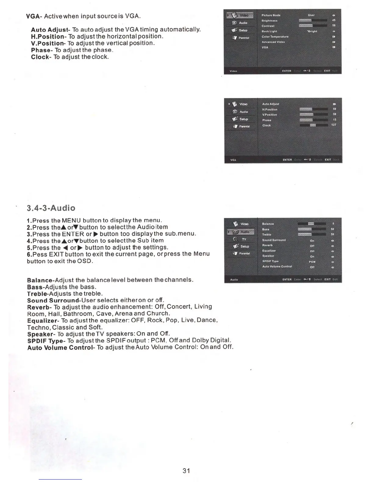 Silo LTV-32PRM - VGA and Audio Settings; VGA Input Timing Adjustments; Audio Configuration Options