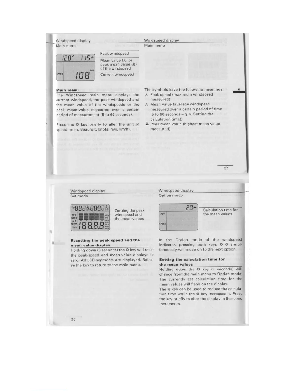 Silva Alba Windwatch - Resetting the Peak Speed and the Mean Value Display; Setting the Calculation Time for the Mean Values; Option Mode