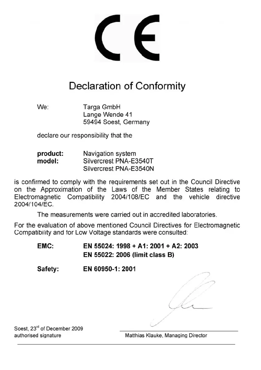 Silver Crest PNA-E3540N - Declaration of Conformity