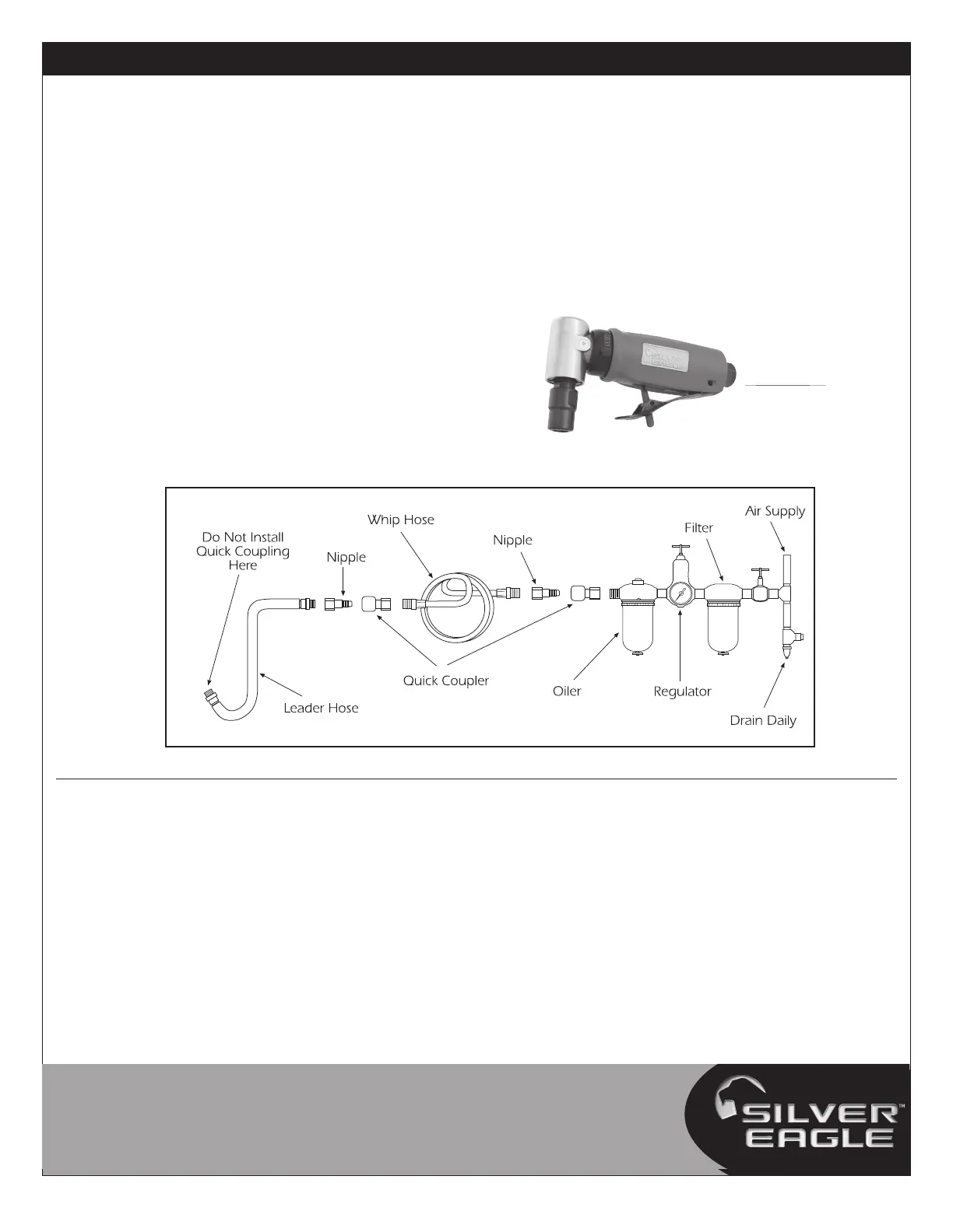 Water in the air line will cause damage to the tool. Drain the air tank daily.