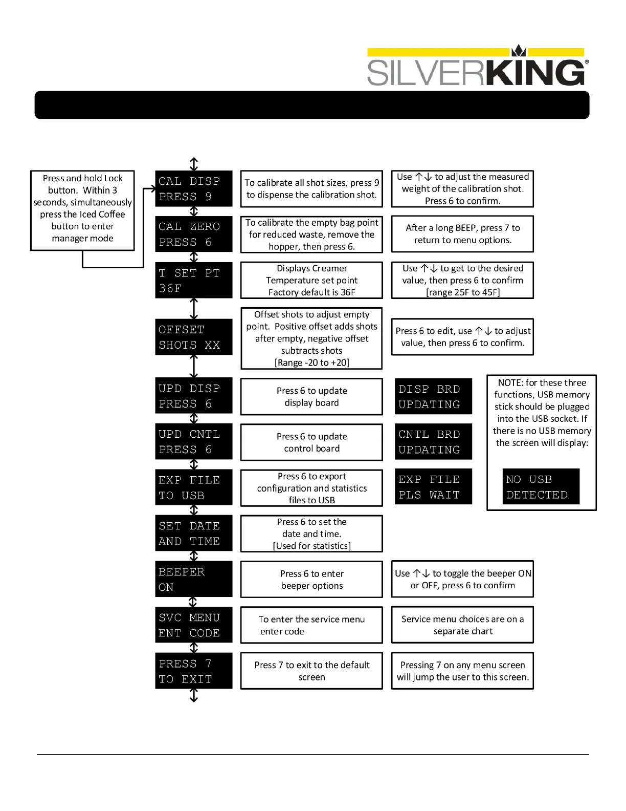Silver King SK-2 - Manager Mode Flowchart; Entering Manager Mode; Calibrate Dispenser; Temperature Set Point