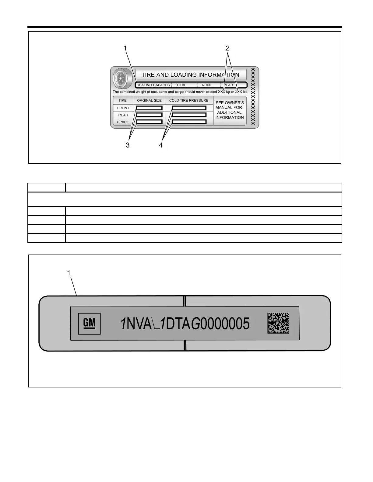 A vehicle-specific Tire and Loading Information label is attached to the vehicle's center pillar (B-pillar) and displays the following