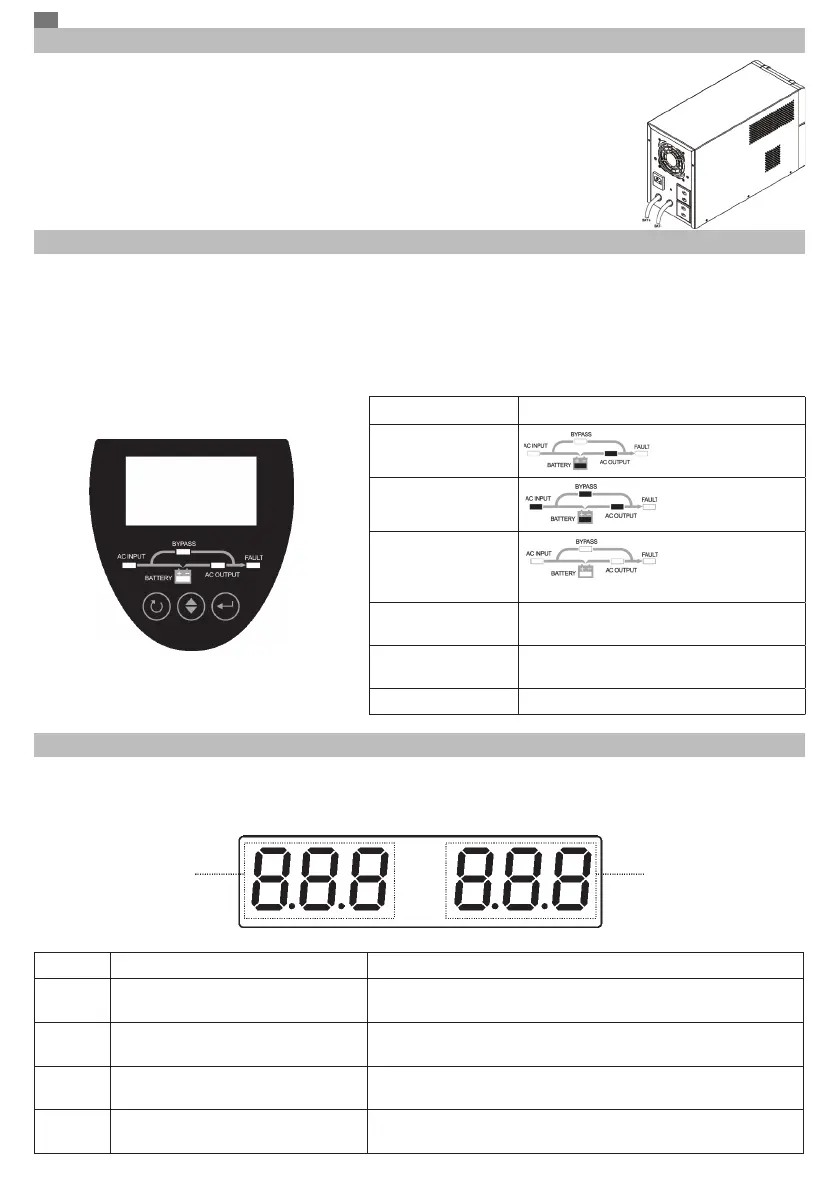 Panoul frontal contine un ecran LCD si cateva indicatoare LED ce arata modul de functionare a dispozitivului.