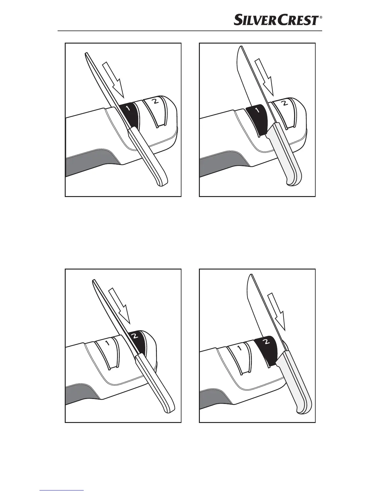 3) Suimkite peilį už rankenos ir geležtę tolygiu judesiu perbraukite per kairįjį