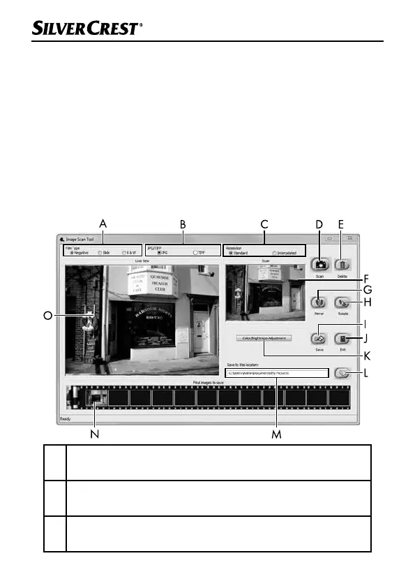 B Sélectionnez ici le format de fichier (JPG ou TIFF) sous lequel