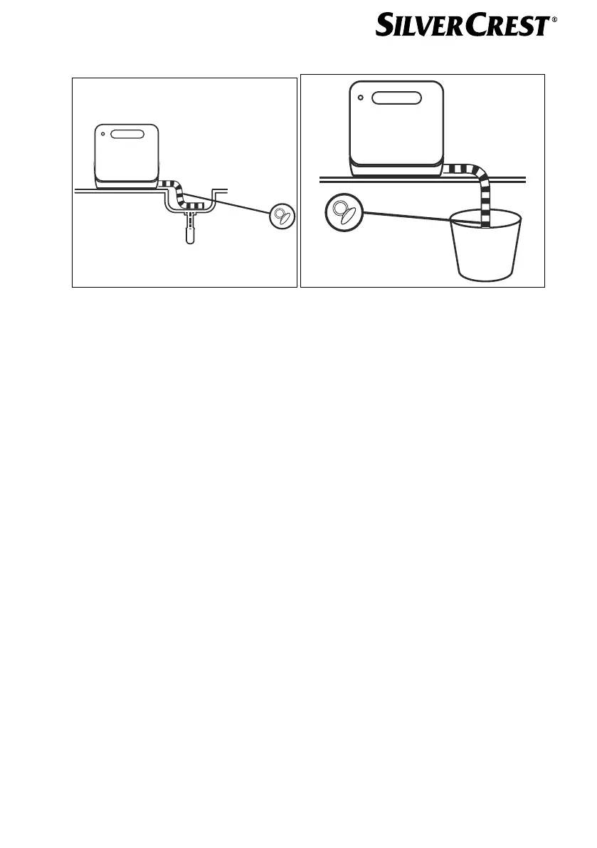 Hang het einde van de afvoerslang in een wastafel (zie afb. I) of een bak die groot