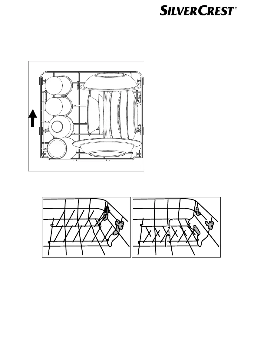 Load the dish rack (8) as shown in the example Fig. O. The arrow shows the slide-in