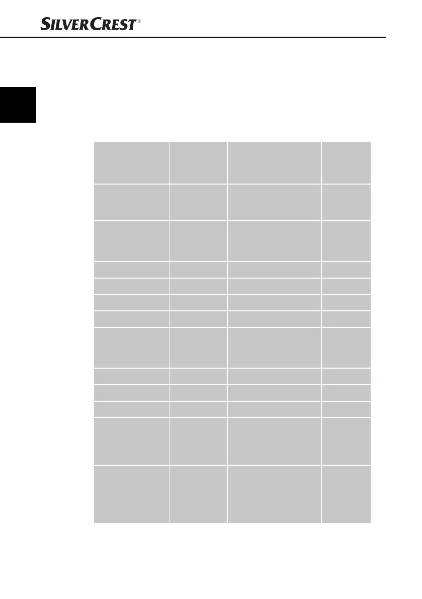 4) Vložte náplň potravín do misky 7. Riaďte sa pritom nasledujúcou tabuľkou: