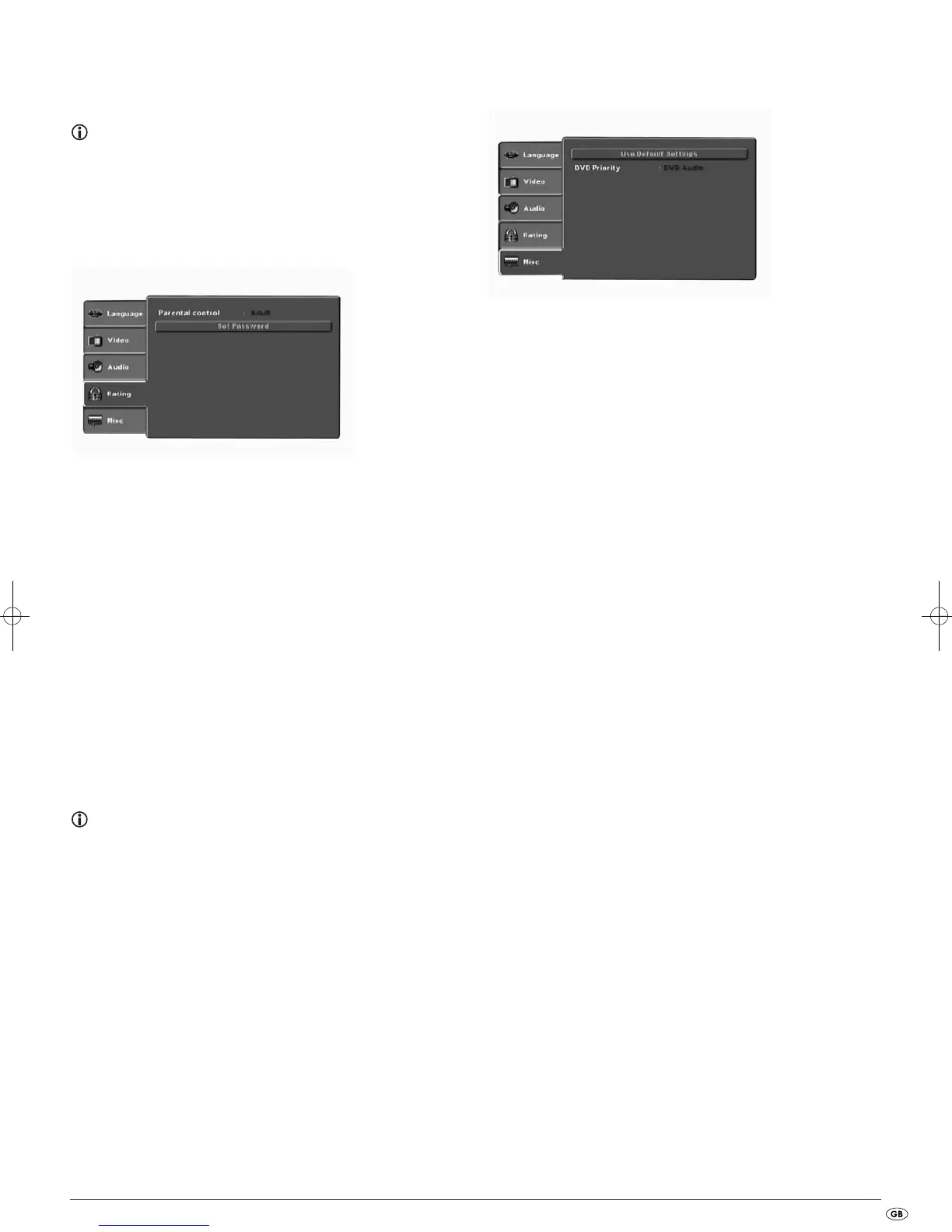 In this menu you can reset the DVD player to the factory default settings and