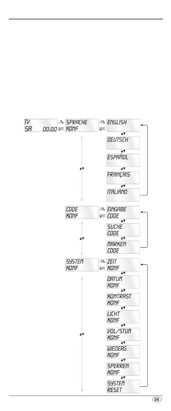 • Einstellung von Menüsprache, Uhrzeit, Datum, Displaykon-