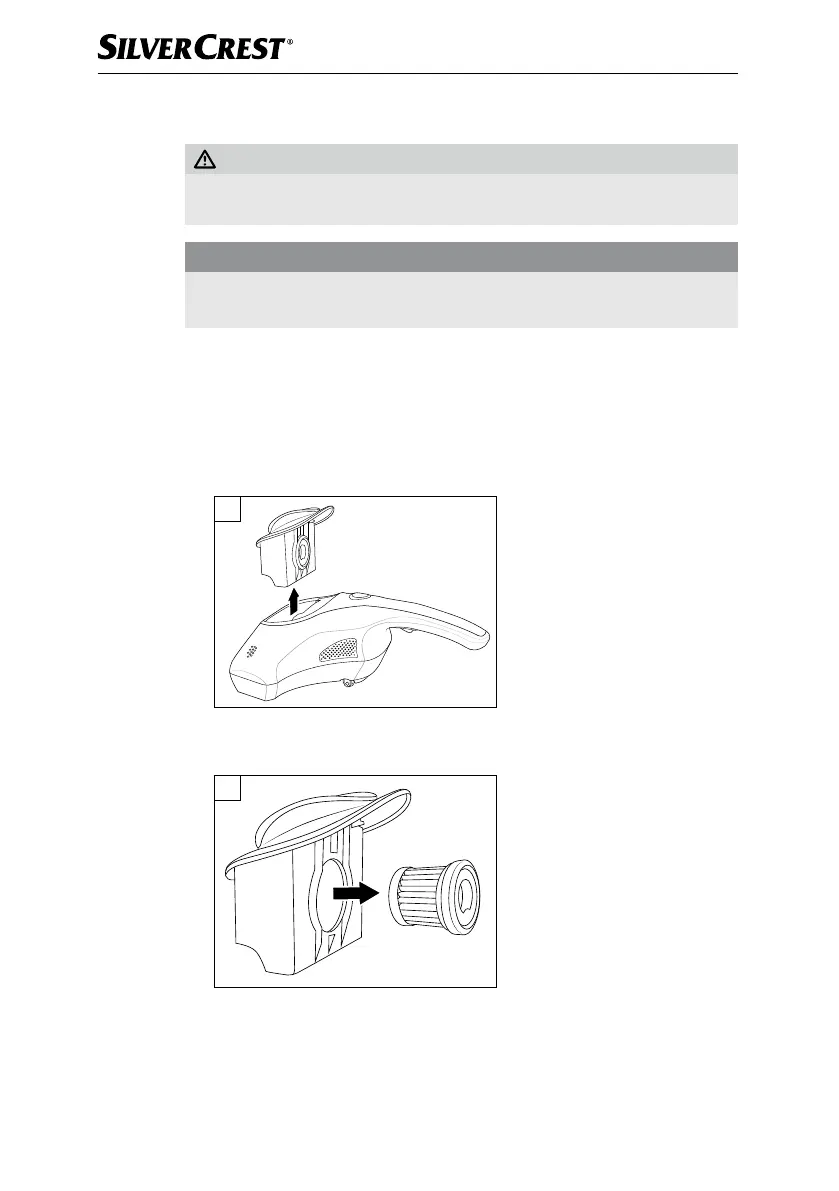 Ƈ Tag fat ind i åbningen på HEPA-støvfilteret 4 og træk det ud af støvbehol-