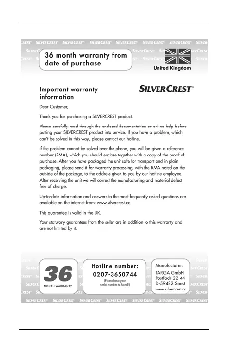 Silvercrest SR-1400 - Details of Guarantee; Important Warranty Information