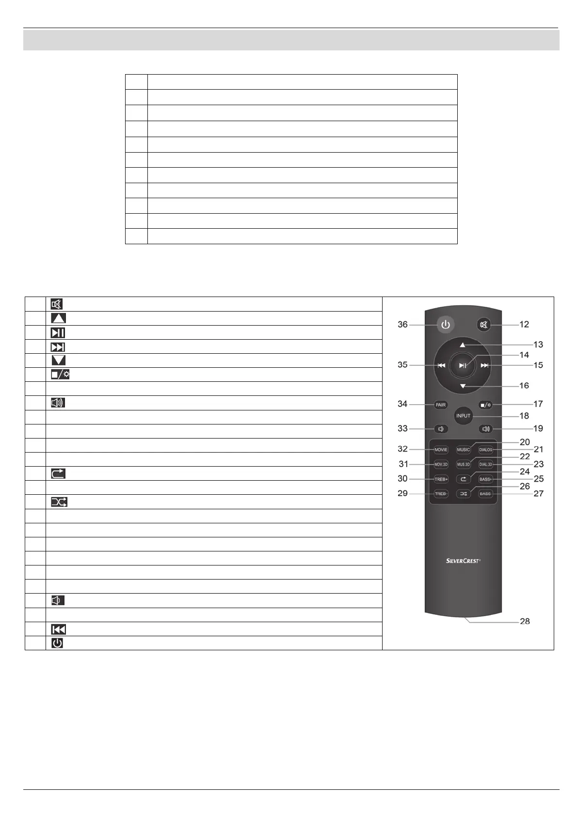 K ovládání funkcí soundbaru lze použít dodávaný dálkový ovladač. Funkce tlačítek naleznete v následujícím seznamu.