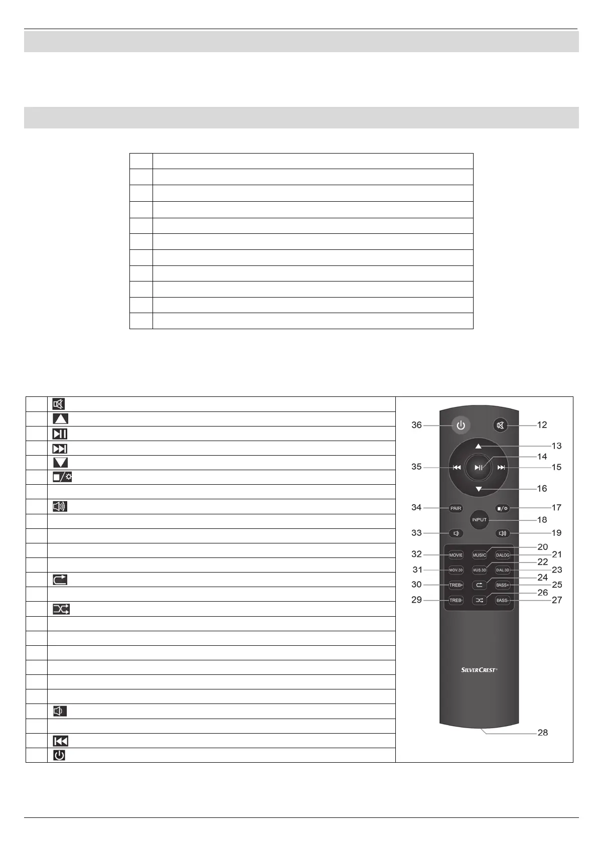 Die mitgelieferte Fernbedienung gibt Ihnen die Möglichkeit, die Funktionen der Soundbar zu steuern. Entnehmen Sie die Tastenfunktionen der nachstehenden