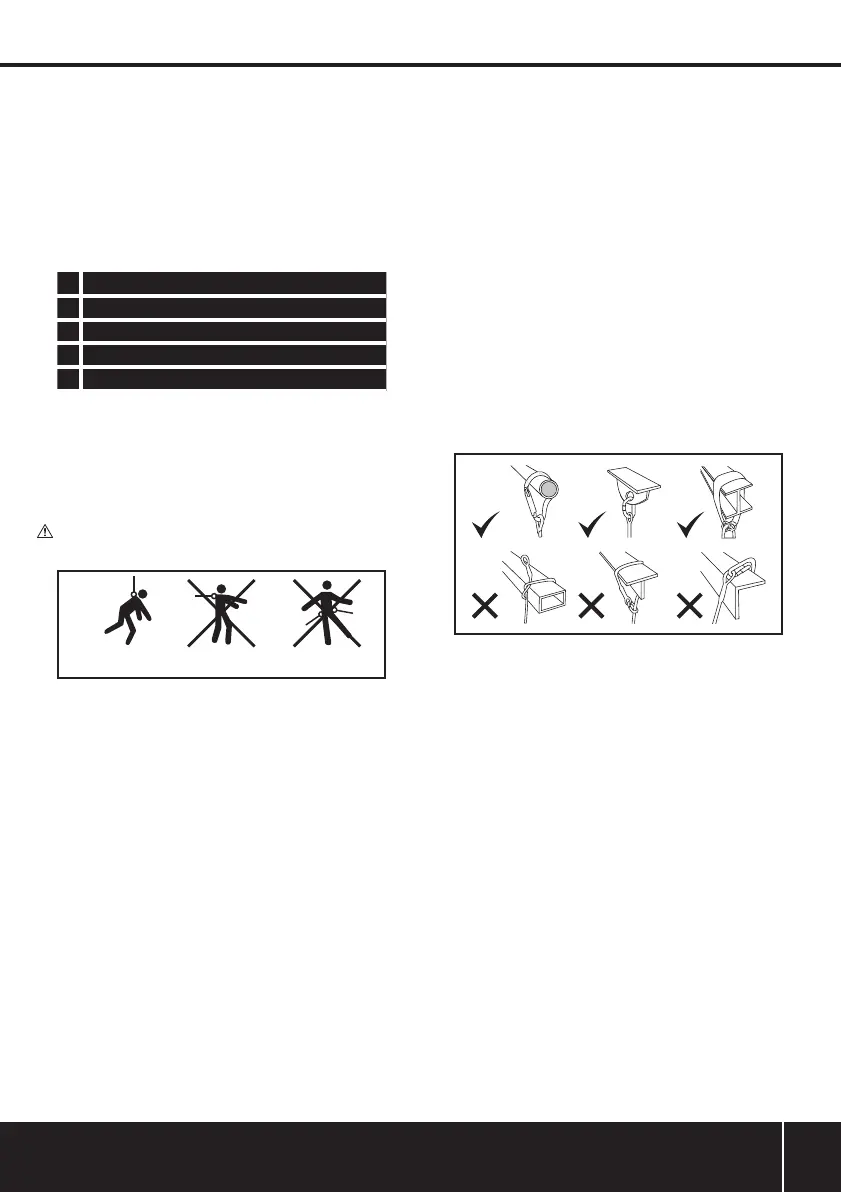 • Controleer de werking van de karabijnhaak (2) en de steigerhaak (1) en