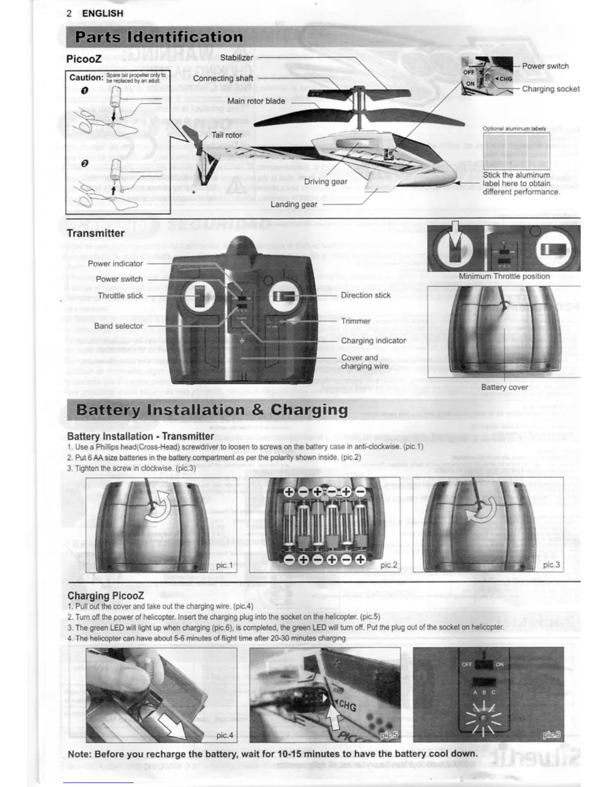 Silverlit PicooZ - Parts Identification; Battery Installation & Charging; Battery Installation - Transmitter; Charging PicooZ