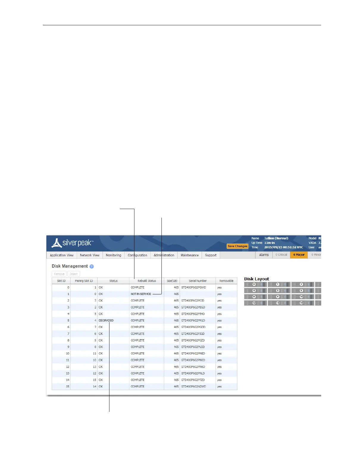 Disk failure results in a critical alarm, and the specific disk’s LED stops illuminating on the appliance.