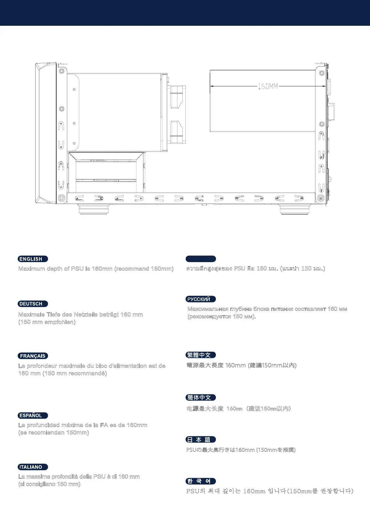 PSU의 최대 깊이는 160mm 입니다(150mm를 권장합니다)