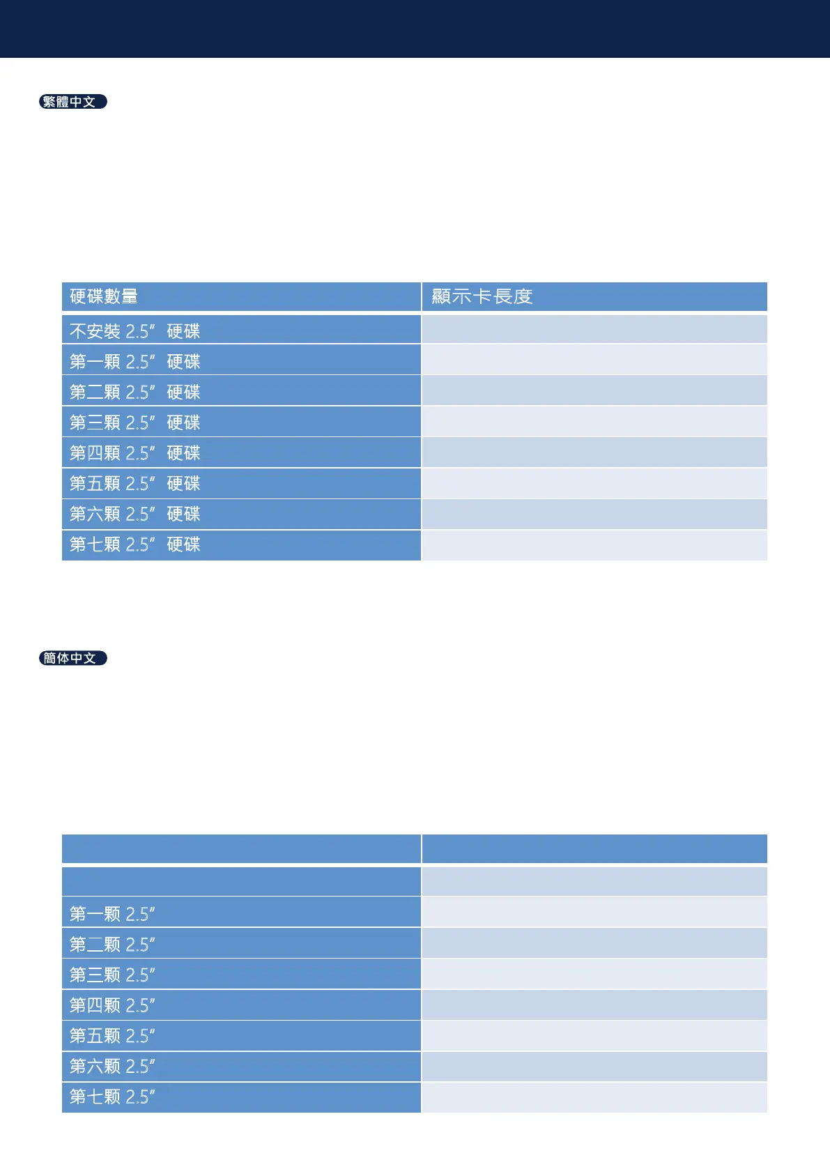 2. CS351顯示卡長度與風扇架下方的2.5”硬碟數量有關,下表是2.5”硬碟與顯示卡長度限制。高度最多148 mm。