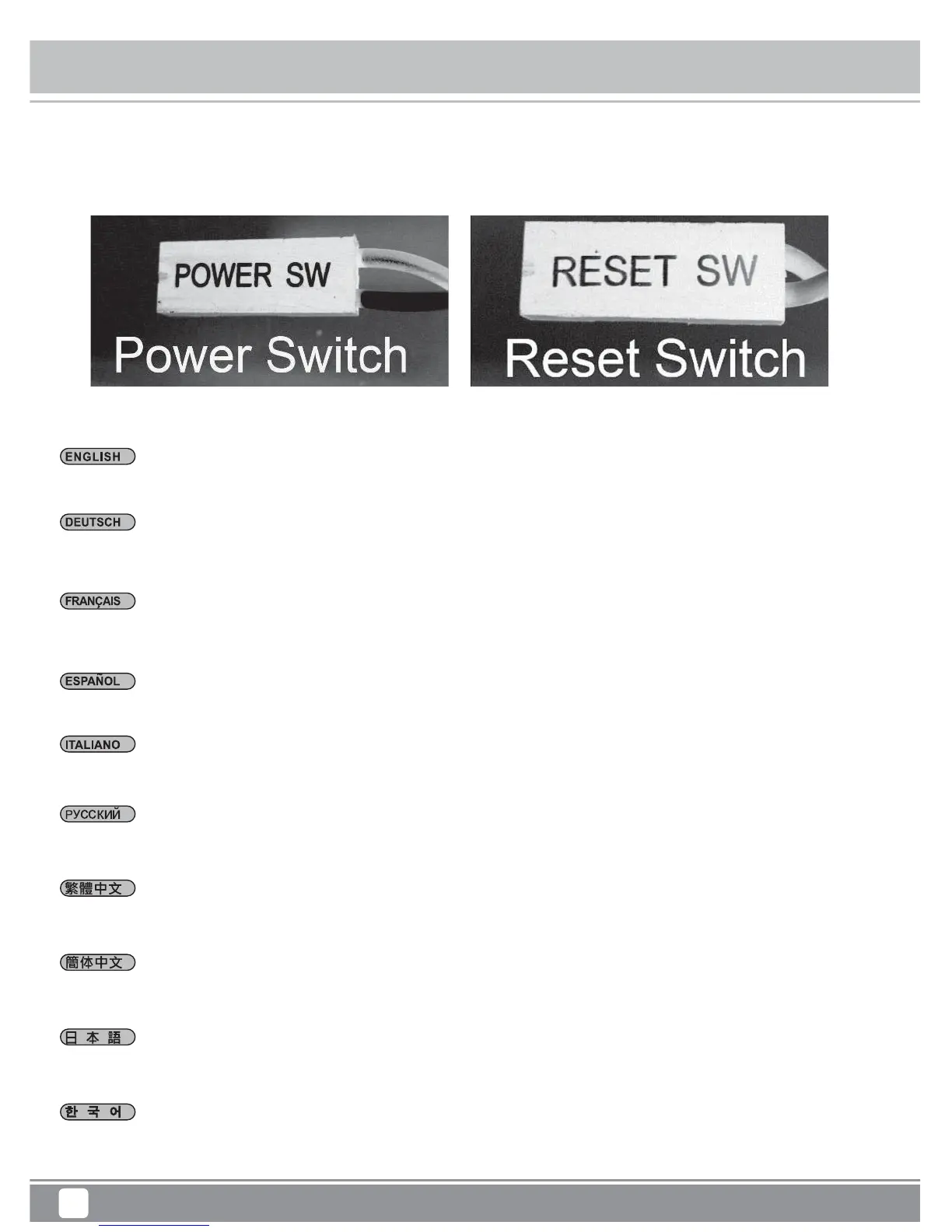 請參考主機說明書的Front Panel Connectors安裝Pin Define,將Connector插上;Power Switch 與Reset Switch並無正負極性之分,反插正插都不影