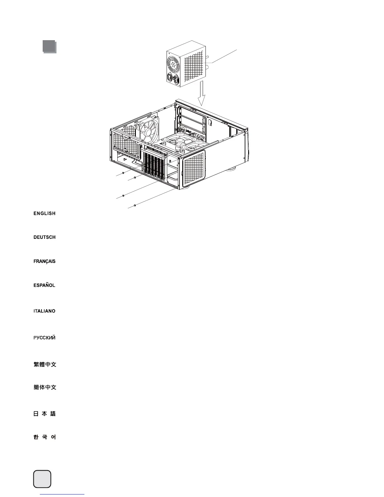 將電源供應器由上放入機殼內,若電源規格為120mm或以上尺寸的散熱風扇,我們建議將風扇朝左(外部)安裝。