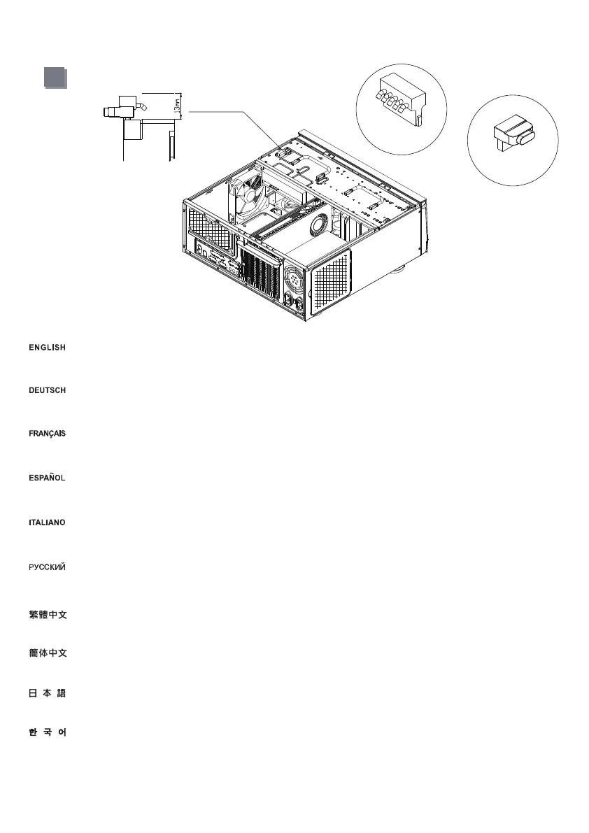 0도 SATA 및 전원 케이블로 모든 장치들 , 특히 가장 오른쪽 3.5" 하드 드라이브를 연결할 것을 권장합니다. 하드 드라이브의 최대 높이는 13mm입니다.