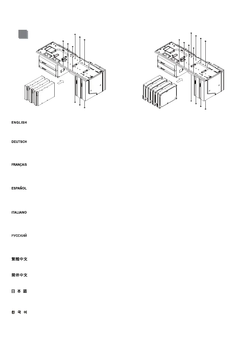3.5”デバイスをドライブケージに設置します。ハードディスクは必要に応じて左・右いずれの向きにも設置できます。ハードディスクとグラ