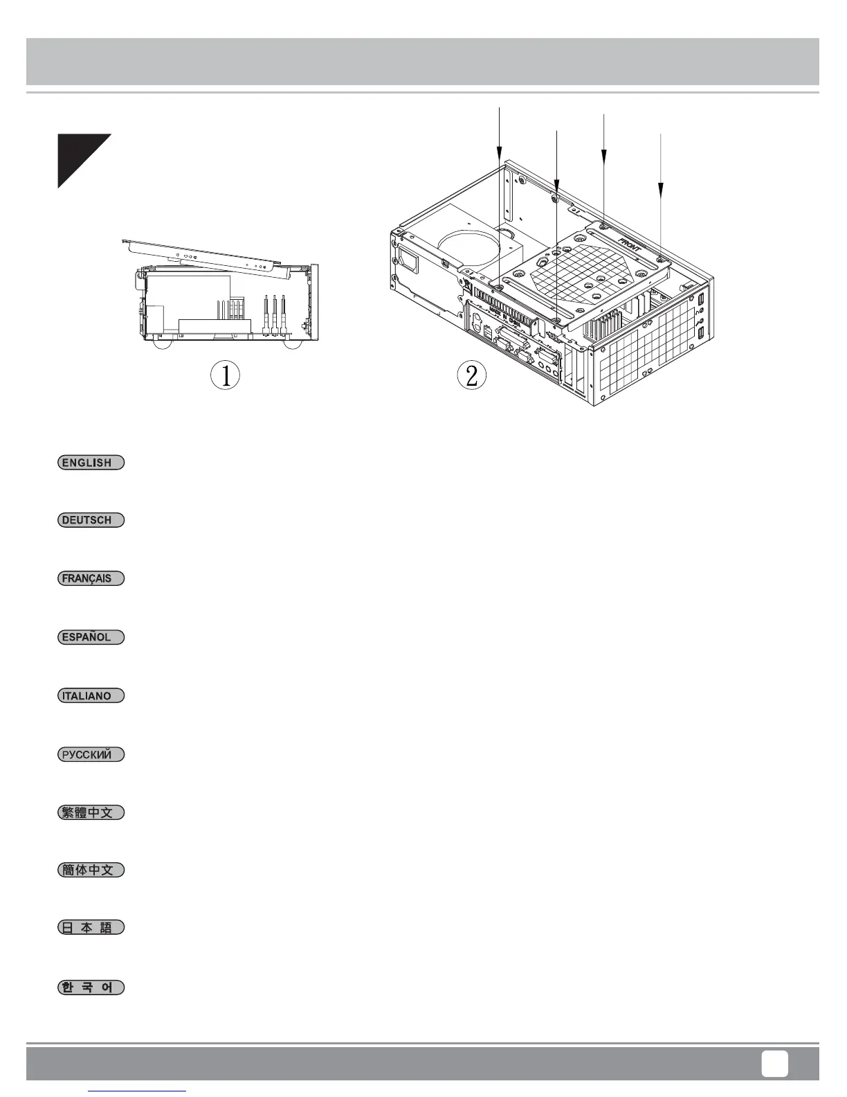 Please insert the drive cage into the case at an angle so the optical drive can line up with the front panel, then secure with