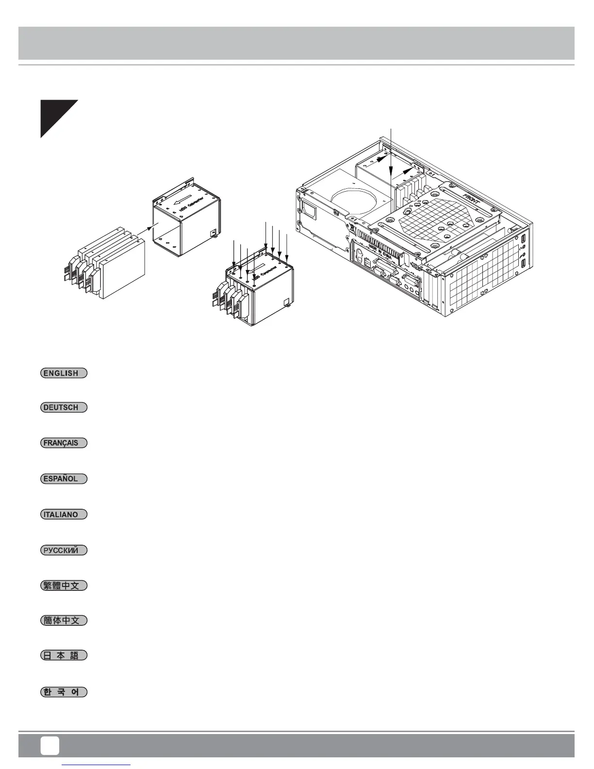 2.5” 드라이브 케이지를 제거합니다. 2.5” 하드 드라이브를 드라이브 케이지에 설치합니다.