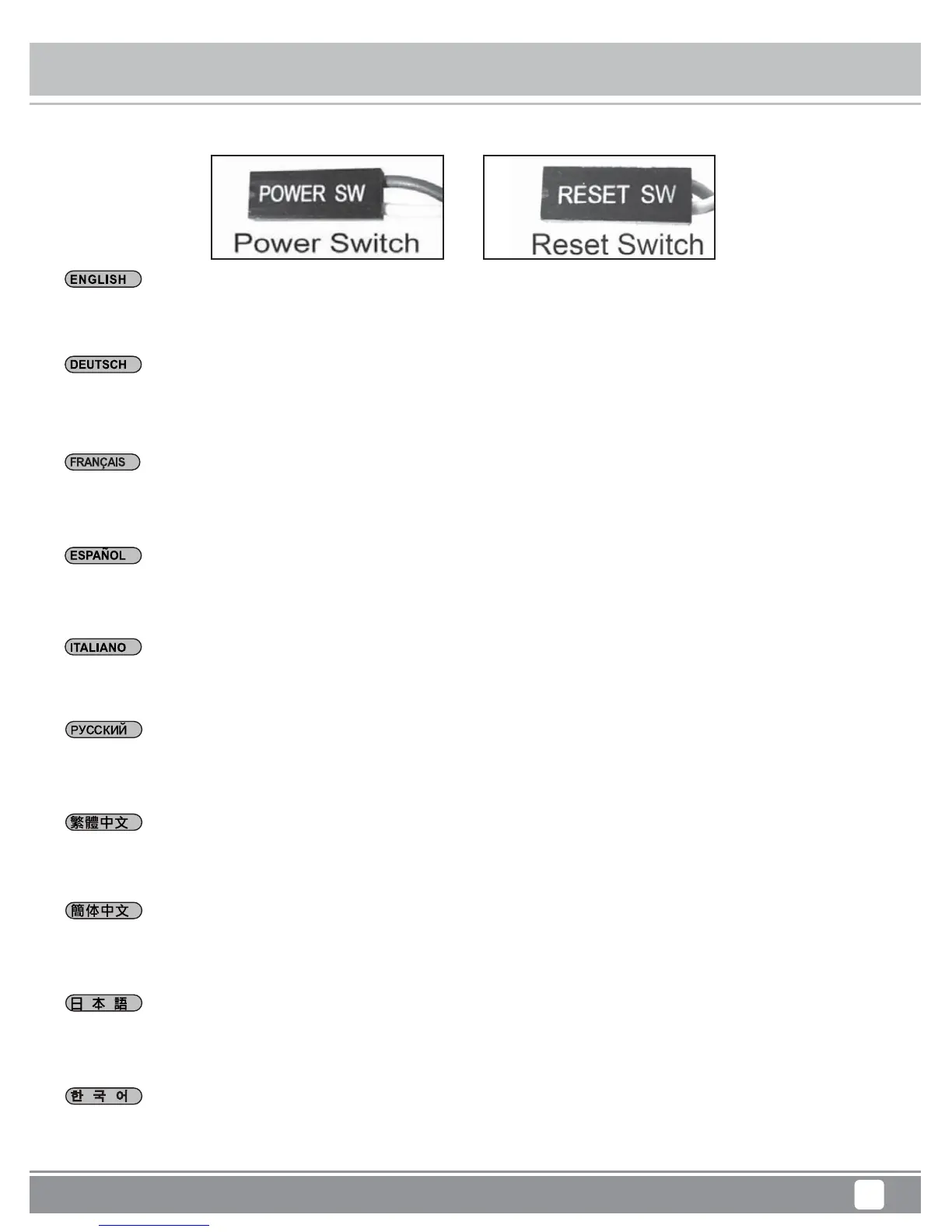 메인보드 매뉴얼의 전면패널 커넥터 혹은 시스템패널 커넥터 핀을 참조하기 바랍니다. 파워 스위치와 리셋 스위치는 극성이 없어