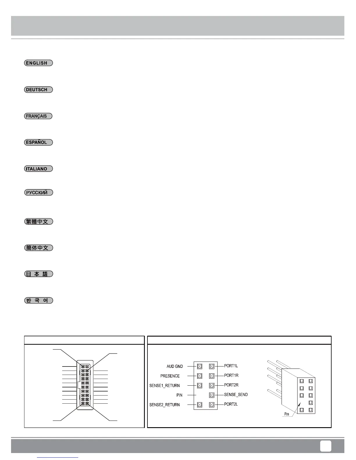 아래는 전면 I/O 커넥터의 핀 사양입니다. 메인보드 매뉴얼을 참조해, 메인보드의 전면 I/O 핀사양을 재 확인한 후 설치합니다.
