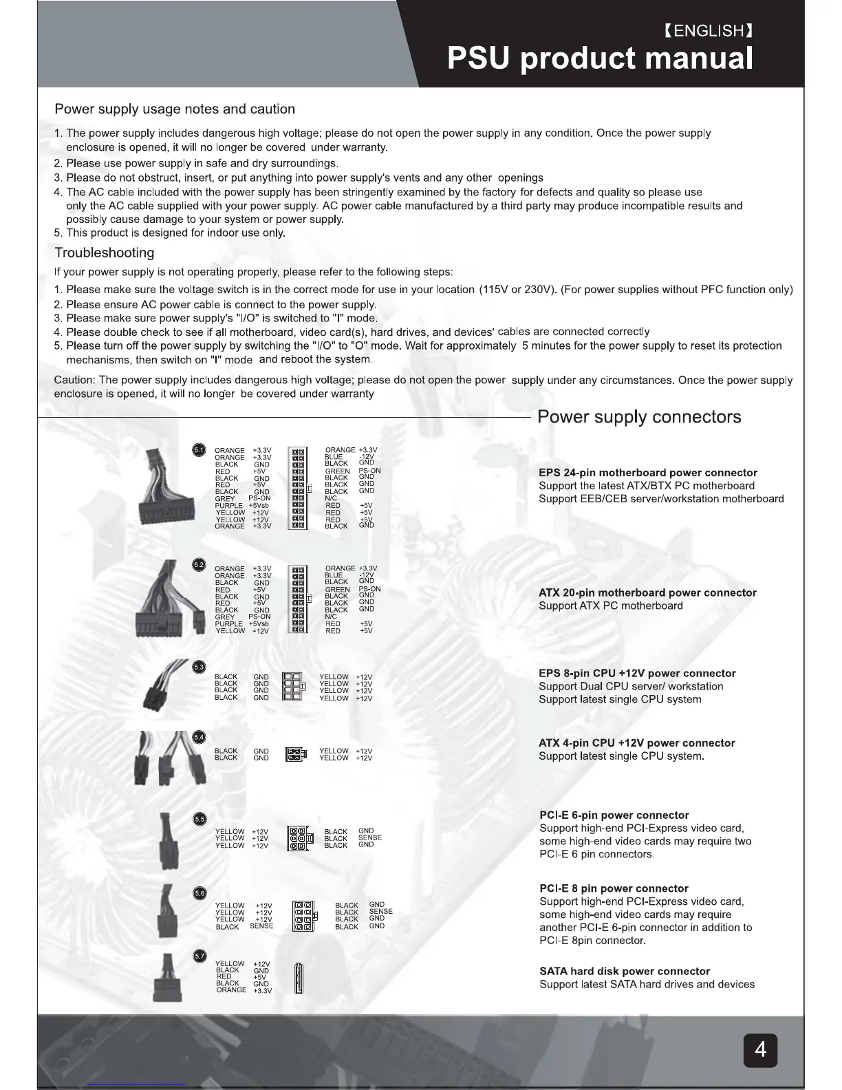 SilverStone PSU - PSU Usage, Troubleshooting, and Connectors; Usage Notes and Cautions; Troubleshooting Guide; Power Supply Connector Types
