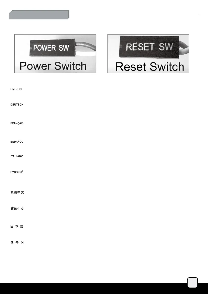請參考主機說明書的Front Panel Connectors安裝Pin Define,將Connector插上;Power Switch 與Reset Switch並無正負極性之分,