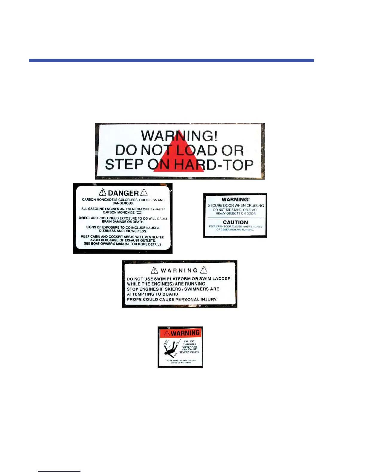 The following Warning Labels appear at various locations on your yacht