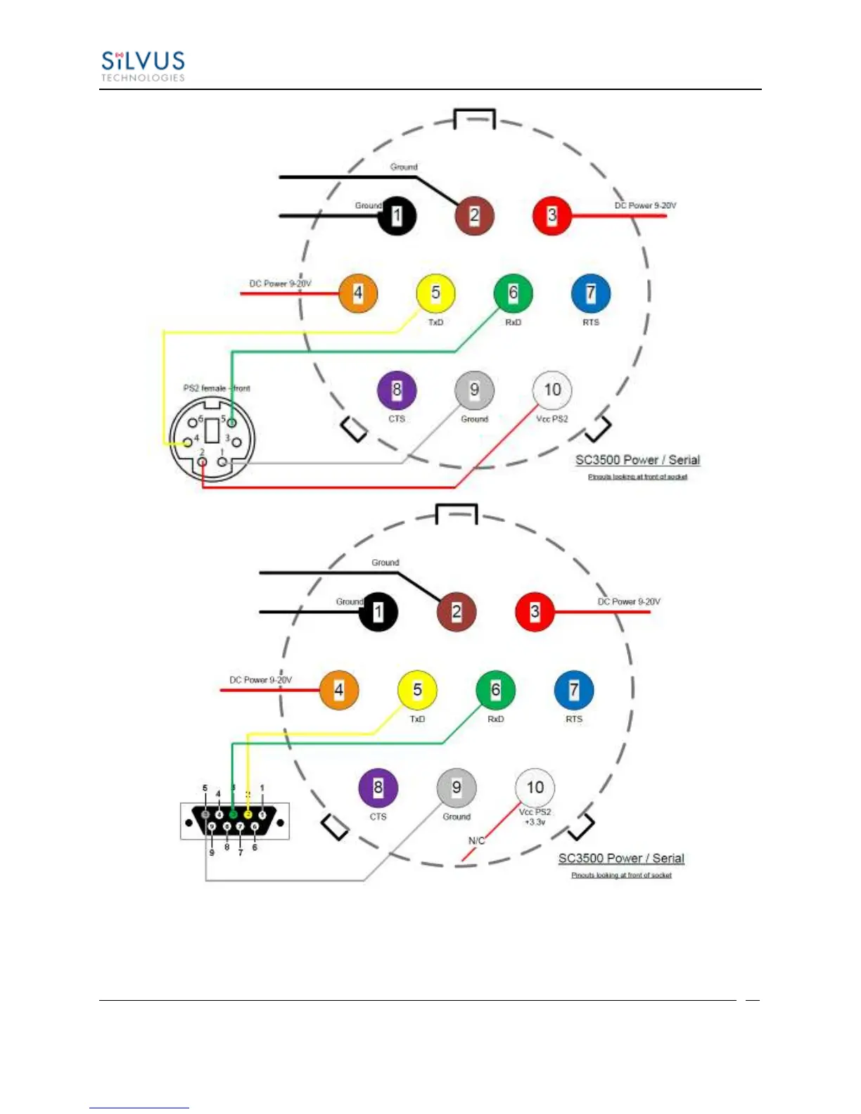 Figure 5 SC3500/SC3800 Power/Serial Pinout Diagram (Cable Side) for GPS (Top) and RS-232 (Bottom)