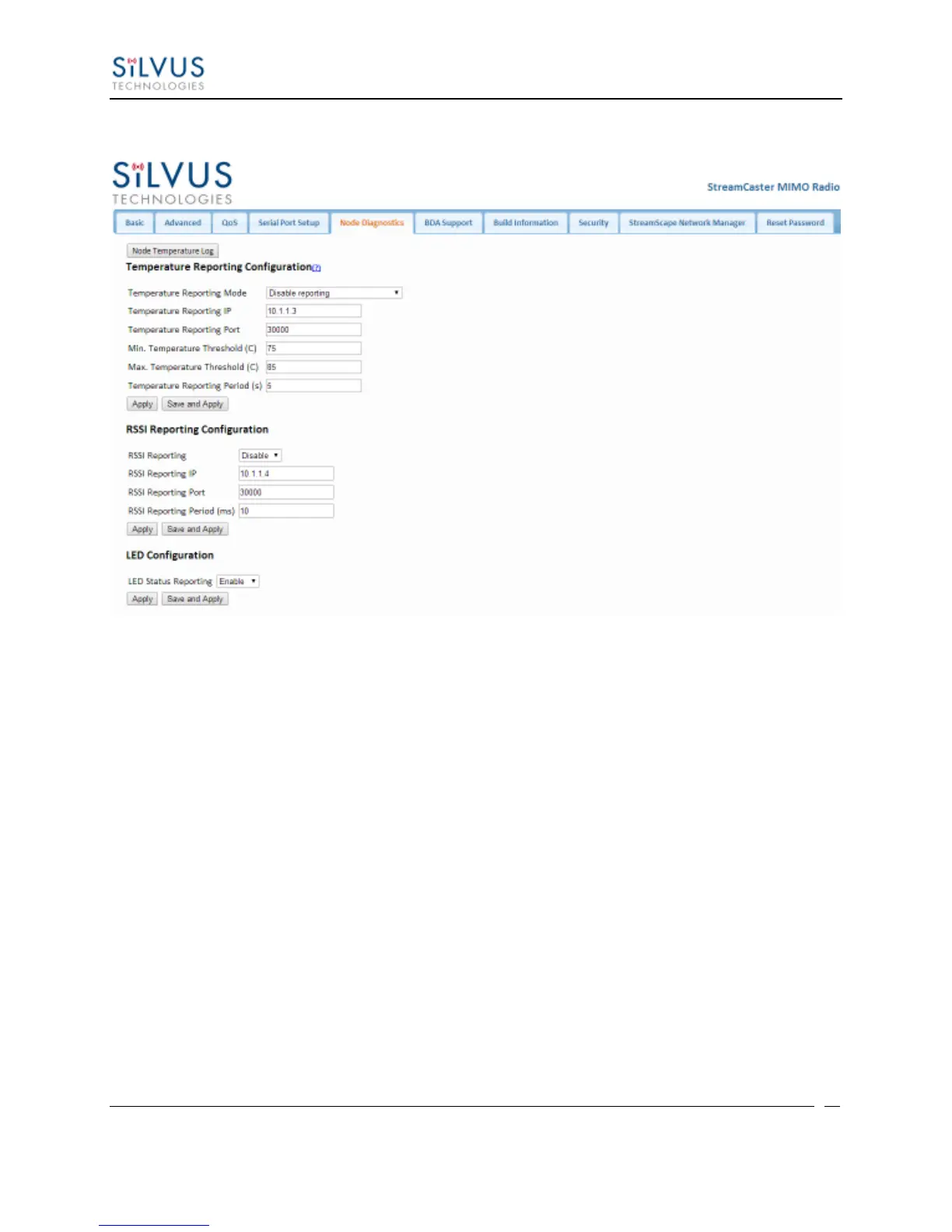 The Node Diagnostics page allows the user to specify an IP and Port number for Temperature