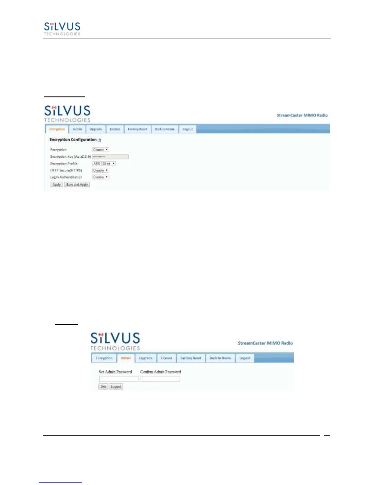 The Security section of StreamScape allows users to enable/disable encryption, upgrade radios,