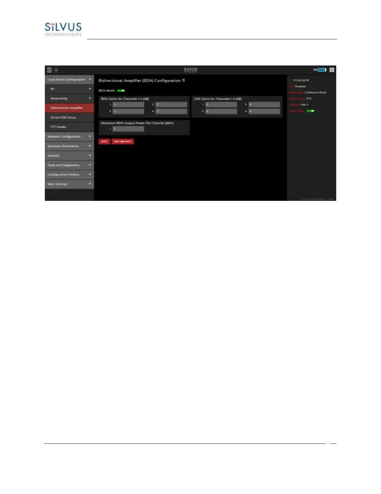 • BDA Gains for Channels 1-4: Enter the gain (dB) for the power amplifier connected to each